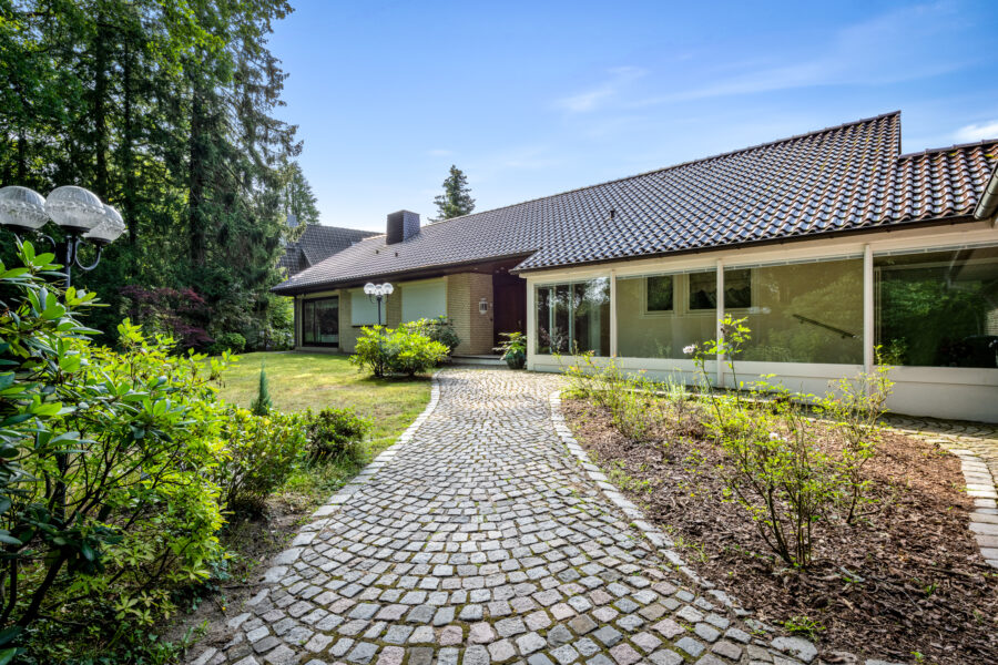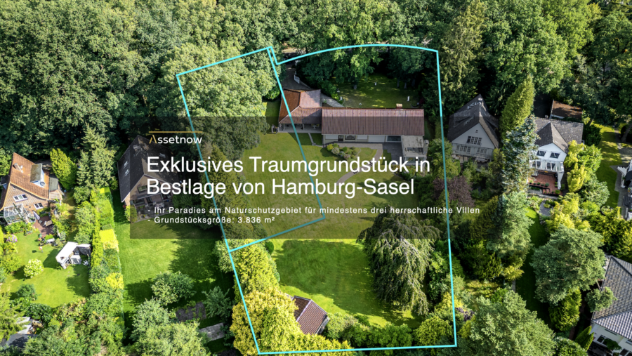 Das Baugrundstück befindet sich im idyllischen und grünen Stadtteil Sasel, einem der begehrtesten Wohngebiete im Norden Hamburgs. Die Adresse bietet eine ruhige, naturnahe Umgebung mit viel Grünflächen und einer harmonischen Nachbarschaft. Das Grundstück selbst umfasst eine Fläche von 3.836 m² und ist von üppiger Vegetation umgeben, die eine angenehme, ruhige und private Atmosphäre schafft. Es besteht die Möglichkeit, das Grundstück ab 1.000 m² zu teilen, wodurch sich die Option ergibt, bis zu drei Einfamilienhäuser zu errichten.