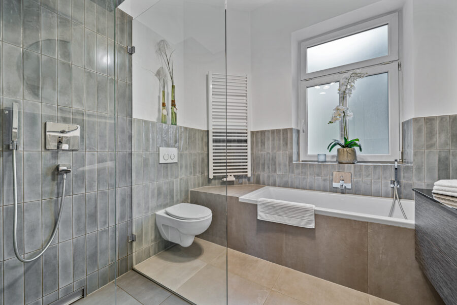 Über das Treppenhaus gelangen Sie direkt zur Erdgeschosswohnung und werden mit Eingang im länglichen Flur empfangen. Dieser verbindet sämtliche Räume, die in sich separiert und geschlossen werden können. Rechts dem Flur entlang gelangen Sie zu Ihrem ca. 43 m2 großen lichtdurchfluteten Wohn- und Essbereich mit Einbauküche. Dieser wird geschickt über einen Höhenversatz mit Trittstufen aus Holzdielen zwischen Wohnbereich und Küche/Essbereich getrennt. Besonders hervorzuheben sind die toll erhaltenen Stuckelemente und 6 großen zweifach-isolierverglasten Fenstern, wodurch der Raum sehr einladend, hell und warm wirkt. Neben dem finden Sie eine Tür weiter Ihren Schlafraum mit ca. 16 m2, ebenfalls mit toll erhaltenem Stuck und zwei großen Fenstern.Links entlang dem Flur finden sich ein Hauswirtschaftsraum mit Technik und Ihr hochwertig saniertes Vollbad mit stilvollen schwarzen Fliesen, bodengleicher Dusche, eine Badewanne, Waschbecken und ebenfalls mit Fenster zum Innenhof. Zum Ende hin des Flurs finden Sie ein zweites ca. 11 m2 großes Zimmer zur flexiblen Nutzung, z.B. als Kinderzimmer oder Büro. Hierüber gelangen Sie zu Ihrer 30 m2 großen Terrasse im Hinterhof, der zu tollen Grillabende mit Familie und Freunden einlädt.